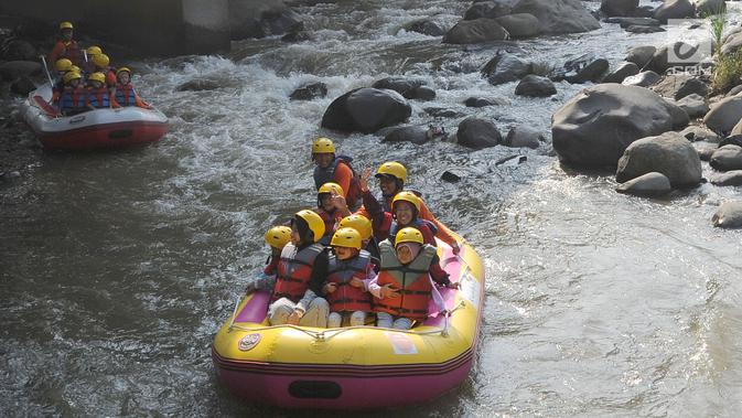Murid TPQ Kelopak Kalisari Jakarta saat wisata rafting khusus anak di kawasan Bendungan Katulampa, Bogor, selasa (20/11). Dengan membayar Rp 20 ribu, rafting ini menjadi salah alternatif pengenalan lingkungan alam sejak dini. (Merdeka.com/Arie Basuki)