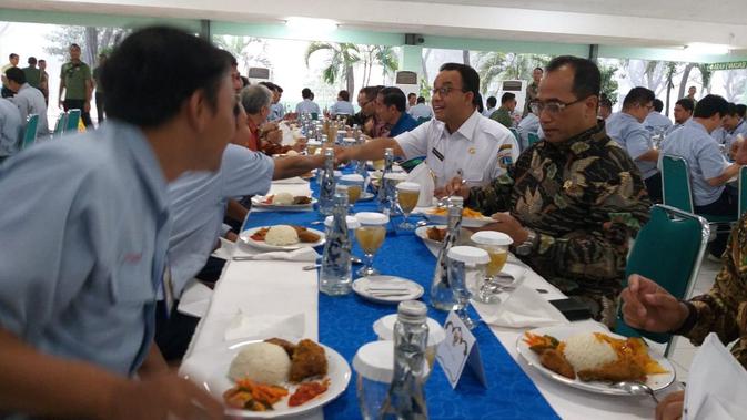 Jokowi dan rombongan menteri serta Gubernur DKI Jakarta Anies Baswedan ikut makan bersama ratusan pegawai. Mereka menyantap sajian yang sama dengan para karyawan dengan porsi lumayan banyak.