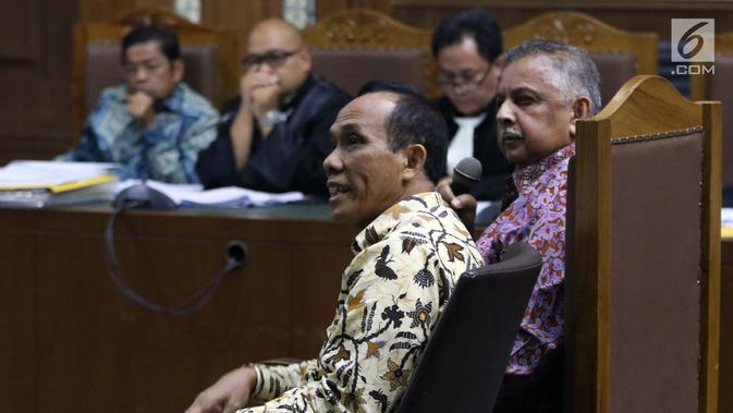 Dirut PT PLN Persero, Sofyan Basir (kanan) bersama Direktur Pengadaan Strategis 2 PT PLN Supangkat Iwan Santoso saat menjadi saksi sidang dugaan suap pembangunan PLTU Riau-1 di Pengadilan Tipikor, Jakarta, Selasa (12/2). (Liputan6.com/Helmi Fithriansyah)