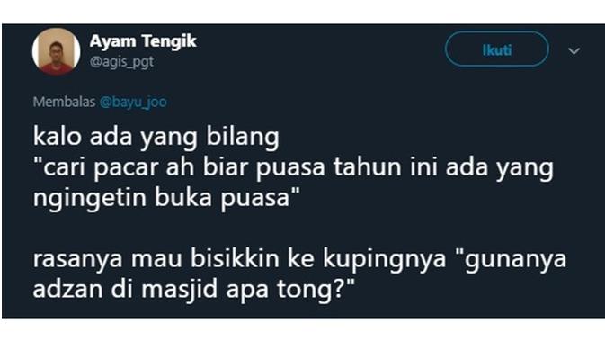 Dirangkum Liputan6.com dari akun @bayu_joo, Minggu (5/5/2019) berikut ini beberapa curhatan netizen tentang ingin punya pacar untuk bangunkan sahur.