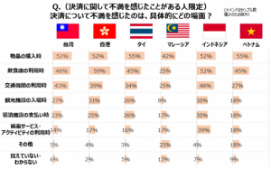 また、訪日経験がある人を対象とした決済方法での不満に関する調査では、台湾・香港・インドネシア・ベトナムの4か国で3~4割が不満を感じた経験があると答えており、決済関連はインバウンド受入れにおける大きな課題であると言えそうだ。具体的にどの場面で不満を感じたのかとの問いでは、各国とも上位は「物品の購入時」「飲食店の利用時」「交通機関の利用時」の3つだった。