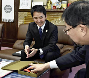高橋さんは、室井市長に現地での活動の様子などを報告、キルギス政府から授与された勲章やメダルも披露した。JICA二本松(二本松市)の富安誠司所長らが同席した。