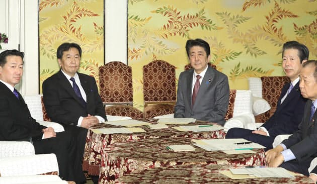 安倍晋三首相(自民党総裁)は4日夜、国会内で立憲民主党の枝野幸男代表ら野党5党首と相次いで会談した。「新型インフルエンザ等対策特別措置法を改正して新型コロナウイルスに適用できるようにしたい。協力して頂きたい」と要請した。枝野氏は現行の特措法を適用すべきだと指摘した上で「審議を急ぐことには協力する。協力できることは最大限やっていきたい」と述べた。