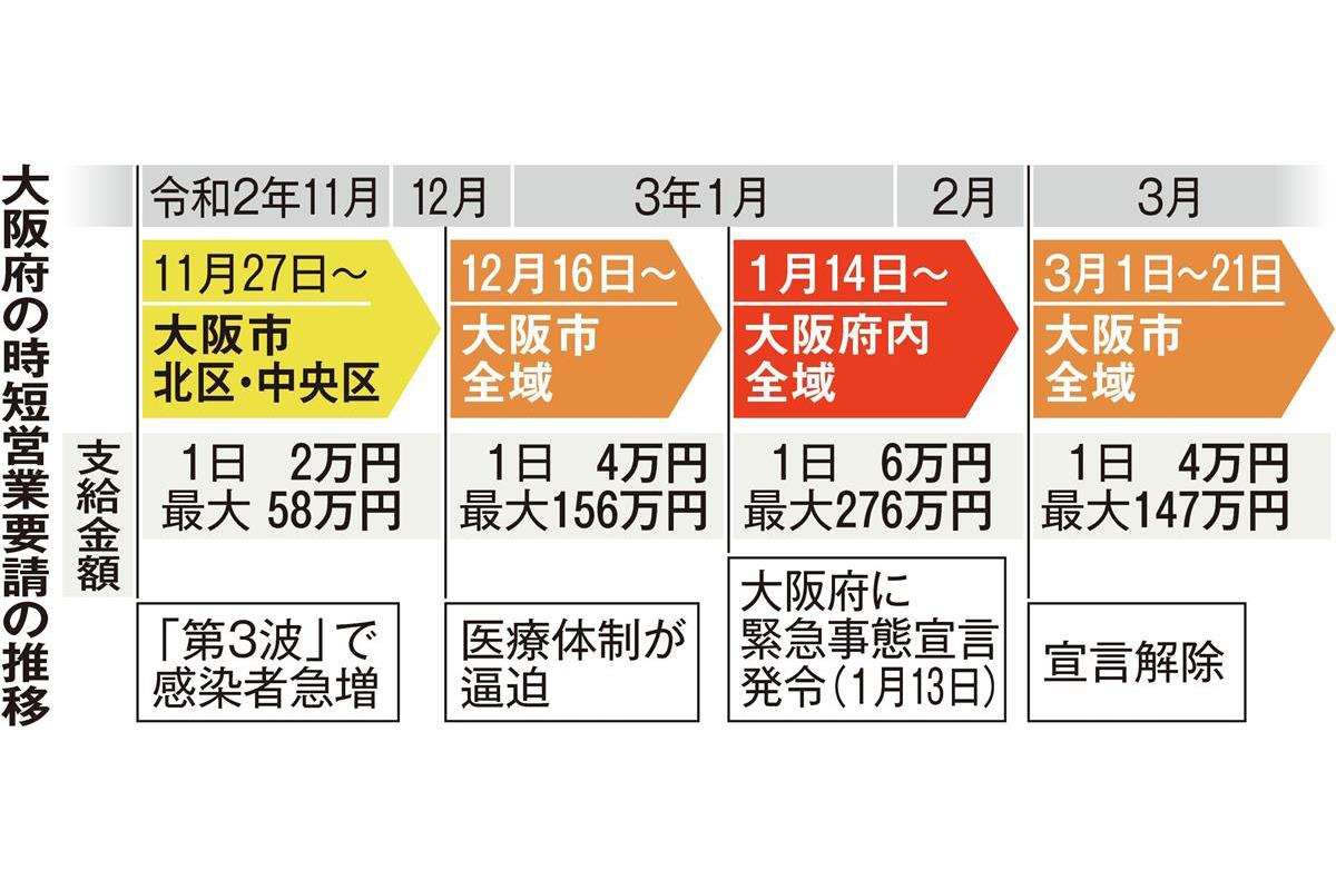 新型コロナウイルスの感染拡大防止に向け、営業時間短縮要請に応じた大阪の飲食店への協力金をめぐり、店側から「支給のスピードが遅い」といった不満が相次いでいる。年度末を控え、早期支給を望む声は切実だが、昨年12月の大阪市全域への時短要請に応じた店に対する協力金(1日4万円)が支給されたか支給が決まったのはまだ約3割。緊急事態宣言下での時短要請への協力金(同6万円)の申請受け付けも始まっているが、市によると書類の不備なども目立つといい、「慎重な審査」が遅れにつながっているようだ。