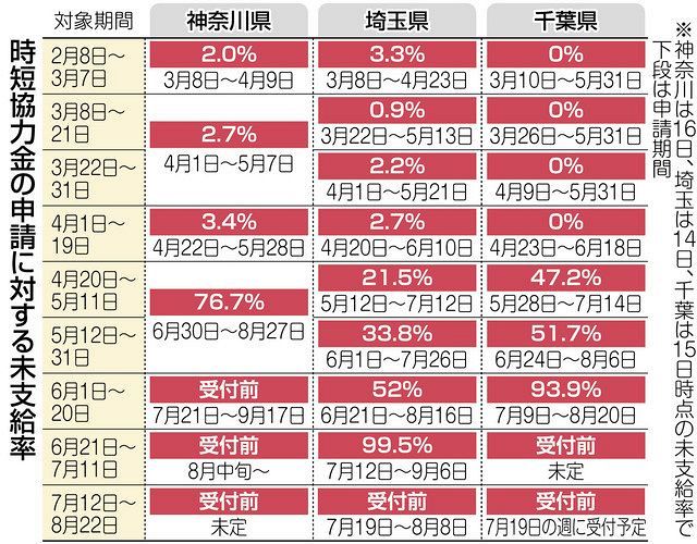 こうした状況の中、3県も先払い制度の準備を進めている。神奈川県は7月20日~8月6日の対象期間で、申請後1週間で支給する予定。埼玉県は申請を7月19日~8月8日に受け付け、8月22日までに支給する見通しだ。千葉県は19日の週に日程を明らかにし、26日の週から支給を始めるという。