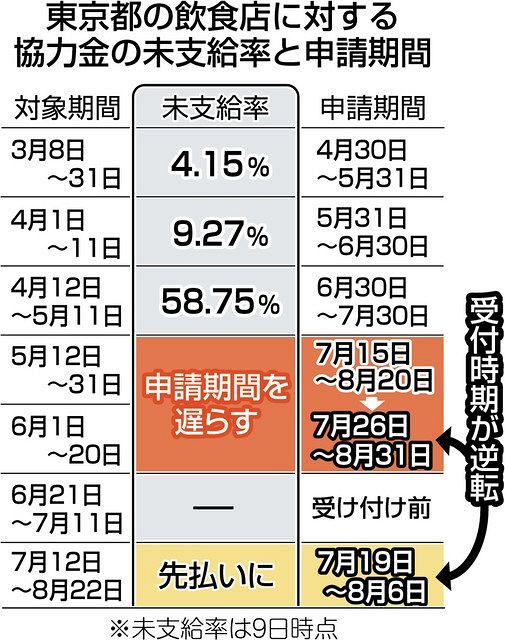 一方、先払いを優先する代わりに、東京都は5月12日~6月20日に協力した分の申請期間を遅らせる。受付開始日が7月15日から26日にずれ、先払いと時期が逆転。支給も後回しにされる可能性がある。
